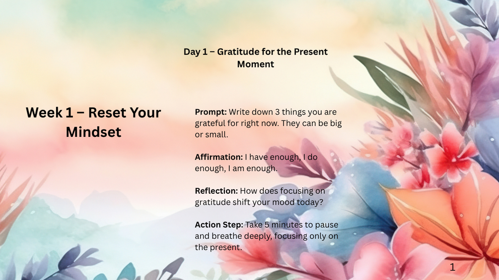 The 21-Day Self-Care Reset Journal is a guided digital journal designed to help busy moms and women recharge their mind, body, and soul. With 21 days of prompts, affirmations, and daily check-ins, this journal makes it simple to build healthy habits, reduce stress, and create balance in just 10–15 minutes a day. Perfect for anyone who feels overwhelmed and needs a structured, supportive way to put themselves back on the priority list.
