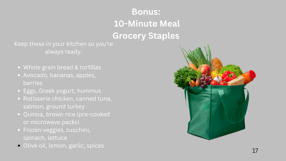 Busy moms deserve easy, healthy meals that fit into real life — not complicated diets. This eBook gives you 12 quick and nourishing recipes, a grocery list, and a weekly meal planner so you can eat smart, save time, and stay energized all week long. Each recipe takes 10 minutes or less, uses simple ingredients, and is designed for moms who want balance between health and convenience.